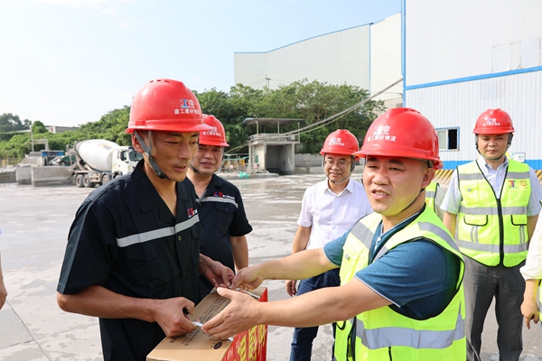 7月22日上午,集团纪委书记、监察专员严名平一行到建材物流公司第一混凝土分公司,为高温期间坚守在一线工作的基层职工送上防暑降温慰问品,并代表集团党委、工会向基层职工送上亲切的慰问。集团工会副主席龚丽萍、第二纪检监察室副主任何钊铧,建材物流公司董事长张兴礼,党委副书记、纪委书记唐开东陪同慰问。