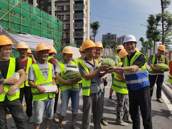 7月21日上午,该司党委副书记、总经理董其强,党委副书记、纪委书记、工会主席谢先成一行来到金科禹洲府精装修项目施工现场,看望奋斗在一线的管理人员和农民工友,为他们送去藿香正气液、老鹰茶、矿泉水、西瓜等防暑慰问品。