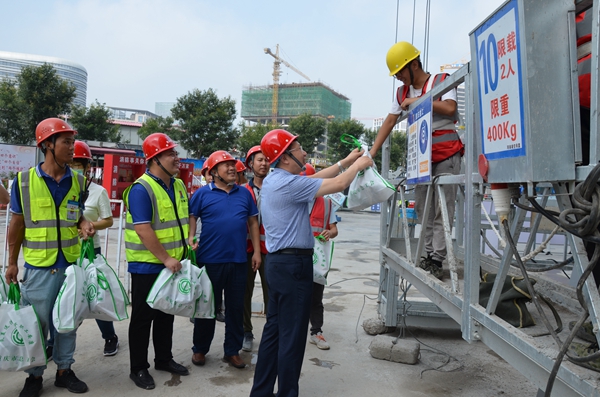 8月12日,重庆市总工会党组成员、副主席王平,重庆市交通建设工会主席杜晓南一行在建工集团党委委员、副总经理夏煦,市政一公司党委委员、监事会主席张庆渝,党委副书记、纪委书记、工会主席褚春昱,党委委员、副总经理黄锡钢等人的陪同下赴国家技术转移郑州中心项目看望慰问在酷暑中坚守岗位、辛勤工作在一线的劳动者,为他们送上了防暑降温物品。