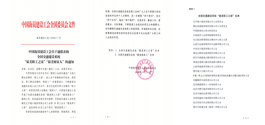 4月14日,中国海员建设工会通报表扬全国交通建设系统“最美职工之家”“最美娘家人”,三建公司工会成为全国20家“最美职工之家”之一,这也是继三建公司荣获“全国模范职工之家”后在建家工作方面取得的又一殊荣。