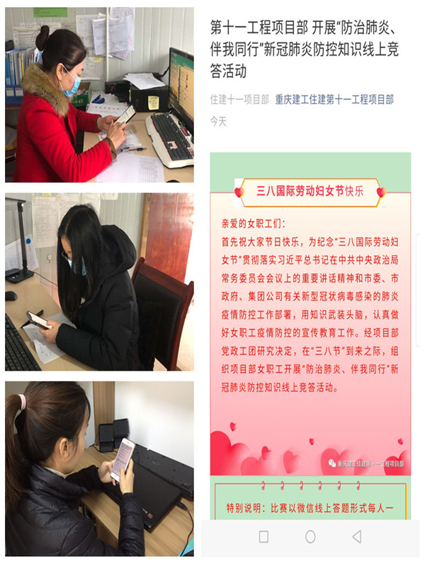 该司第十一工程项目部工会还另行自主设计创作“防治肺炎、伴我同行”防疫知识网络竞赛,组织项目部全体女职工在三八节当日开展微信(线上)答题,答题内容涵盖了“什么是新冠肺炎”“新冠肺炎是如何产生的”“新冠肺炎如何传播”“如何做好新冠肺炎防疫”等。依托轻松、欢乐的竞赛形式既表达了对女职工们的关怀,也有效地向项目部女职工普及了新冠肺炎防疫等相关知识,让女职工们提高防疫主动性、积极性和自觉性,提高自我防护、互救等突发疫情事故的应急处理能力,最终达到减少、杜绝新冠肺炎的发生,防范、达到消除新冠肺炎隐患的目的。