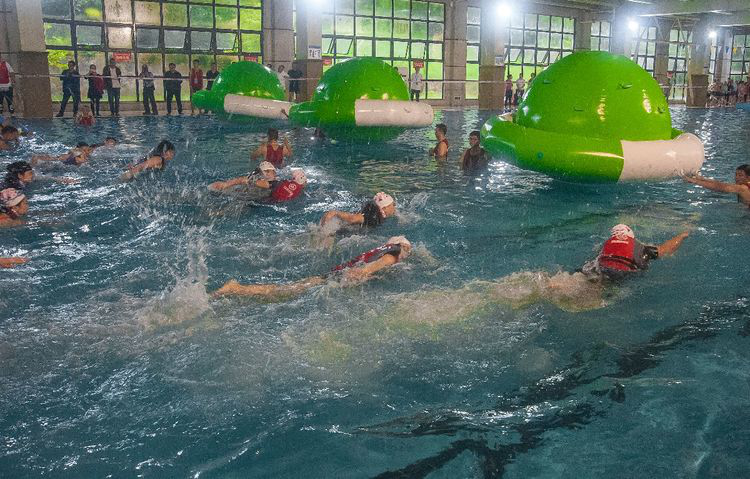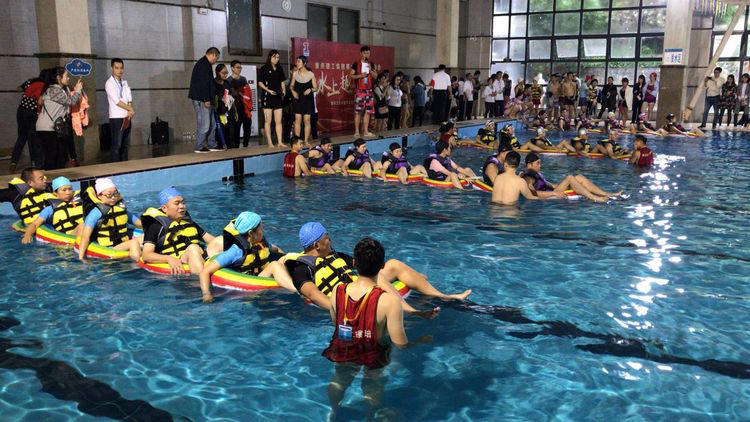 一声哨响,运动员在泳池里劈波斩浪、各参赛队整齐划一的摆臂划动,比拼速度。有的参赛队一路飞速前行,顺利到达终点,大家欢呼喝彩。有的参赛队则手忙脚乱,硬生生划偏了方向,现场不时传来善意的笑声与鼓励。欢乐的心情,注入人心,大家都尽情享受泳池的清爽,感受水上运动的快乐。