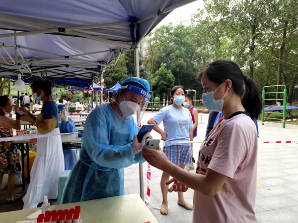 七建志愿者冒着高温酷暑协助社区居民进行核酸检测