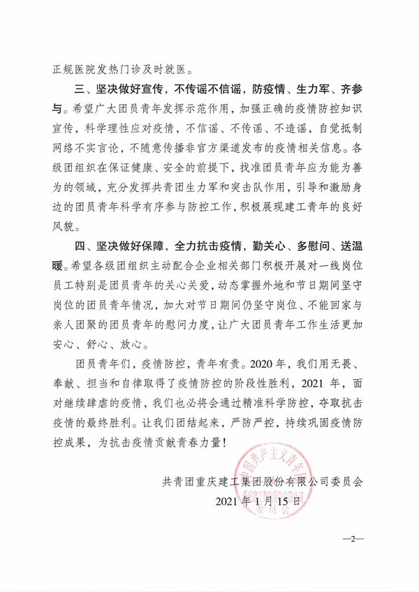 近期,面对新冠肺炎疫情流行加速,多个国家出现病毒新变种,国内部分地区出现多点零星散发病例和局部聚集性疫情,防控形势严峻复杂。同时,春节将至,人员流动性大,疫情防控压力进一步增大。1月13日下午,集团党委召开疫情防控工作专题(视频)会,传达学习贯彻市委市政府疫情防控工作精神,部署当前及下一阶段疫情防控重点工作。根据集团党委疫情防控工作部署,集团团委特向2000余名建工团员青年发出坚决贯彻落实疫情防控要求的倡议。