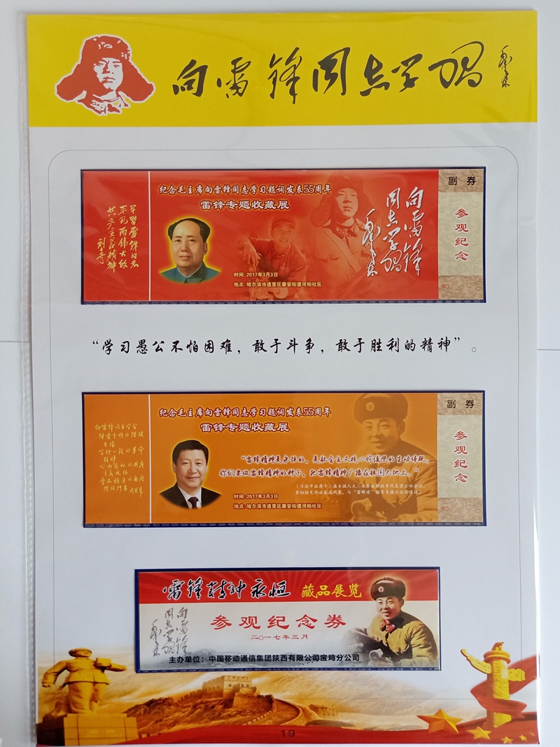 该门票专题作者是重庆门票收藏爱好者傅德明,他是全国著名雷锋专题收藏家之一。该专题于2018年12月在全国第十九届旅游门券收藏展览中获得“最佳编排奖”。专题藏品涵盖全国各地学习雷锋会议、活动、展览的请柬、入场证、胸牌和门票,其中不乏精品和珍品,时间跨度大,各时期学雷锋的门票都有,保存较好的早期票尤其难得。每张贴片制作精致,上部为毛主席题词“向雷锋同志学习”,中部展示各类门票,下部有雷锋日记和总书记讲话。作品具有专题性强,紧跟当前政治形势的特点。这样一种创新的结合方式,让观众在观看展览的同时,能有更现实的切入点,对雷锋精神常学常新,愿意仔细“聆听”总书记阐述其时代意义的“金句”。