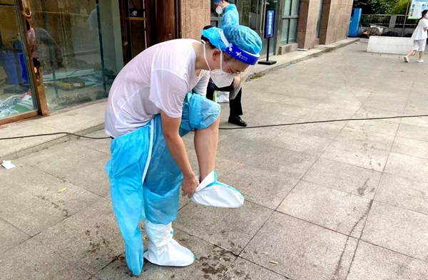 三建公司志愿者脱下防护服后,汗水浸透全身