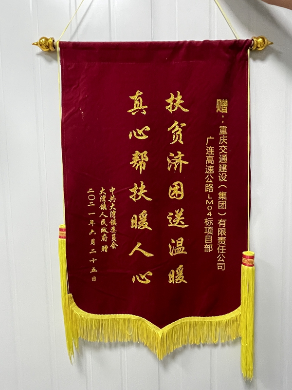 随即,他们将“情系百姓办实事,鼎力相助解民忧”与“扶贫济困送温暖,真心帮扶暖人心”两面锦旗和一块 “爱心资助工程”牌匾送给了项目部。