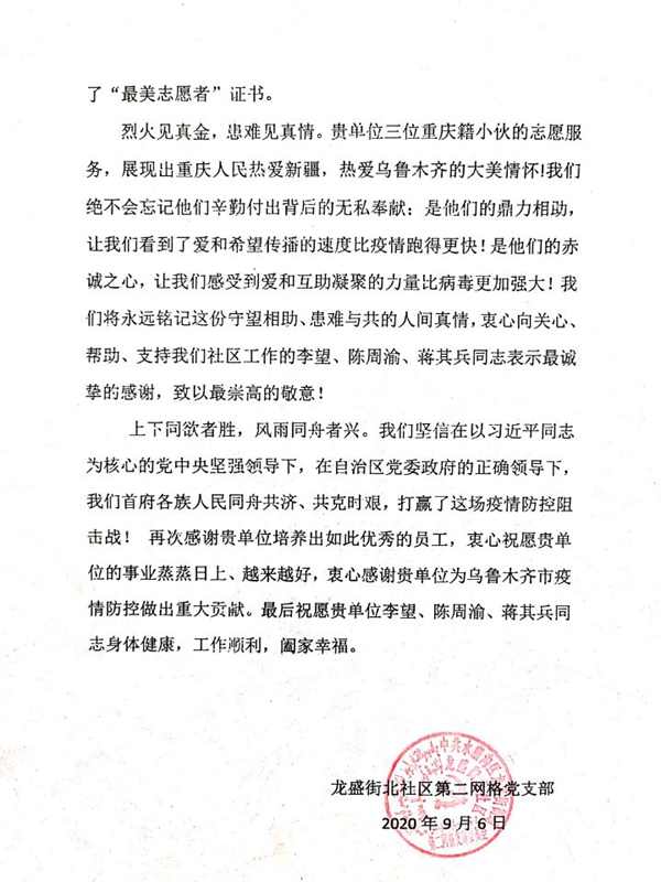 9月7日,新疆乌鲁木齐市的疫情防控工作已经取得阶段性成效。在小区居民的见证下,水磨沟区疫情防控指挥部为在疫情期间作出贡献的志愿者们授予了“最美志愿者”称号,并颁发了“最美志愿者”证书。重庆安装集团新疆分公司的蒋其兵、陈周渝、李望3位志愿者同志位列其中。分公司机关所在的龙盛街北社区第二网格党支部还特地为公司发来了感谢信。