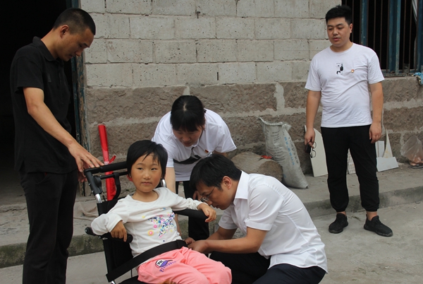 一大早,支部党员就前往涪陵区盘龙社区吴馨雨家慰问。前期,支部从社区志愿者服务中心了解到,涪陵区盘龙社区贫困儿童吴馨雨因从小患有SMA病,全身无力不能站立,也未能入学,家中只有父亲一人挣钱养家,生活十分困难。支部书记向冬梅、肖雄立即联系上当地社区工作者,为她送去一台轮椅、学习用品和慰问金。馨雨开心地笑了:“谢谢叔叔阿姨,联上网后我也可以在家学习了,今后我也能坐着轮椅到院子里看看了。”7岁的吴馨雨虽承受着她这个年龄无法承受的病痛,但面对年迈的外婆、常年外出务工的父亲,她始终是用笑容来面对,乐观地告诉大家她会慢慢好起来。