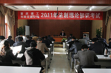 考试采用集中、限时、开卷的方式进行,共87人参加本次考试。其中该司8名领导及27名中层干部集中在该司总部会议室进行了考试,其余52名基层单位领导分别在施工现场自行设置考场完成了考试。考试内容涉及《重庆市突发事件预警信息发布管理办法》、《中华人民共和国道理交通安全法最新修正案》、《中华人民共和国刑法修正案(八)》、《重庆市食品安全管理办法》、《公共场所卫生管理条例实施细则》、《国家赔偿费管理条例》、《国有土地上房屋征收与补偿条例》、《重庆市国有土地上房屋征收与补偿办法(暂行)》、《水土保持法》、《人民调解法》等10部法律法规以及2011年7月1日起施行的《社会保险法》的相关内容。