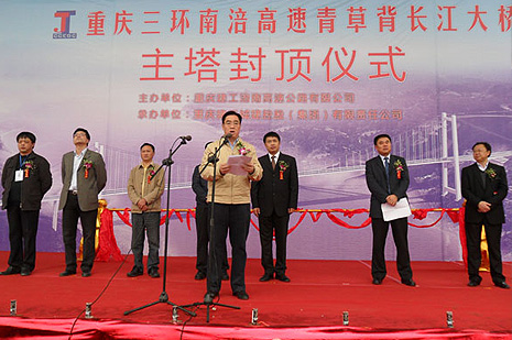杨镜璞董事长在会上发表了鼓舞人心的讲话。他说,南涪路全体参建者特别能吃苦,特别能攻关,特别能战斗。南涪高速青草背长江大桥能取得今天的成绩是所有参建员工共同努力和无私奉献的结果。之前,由桥梁公司施工的南涪路LJ16施工段北主塔工程已于11月5日率先封顶,这为二建公司LJ15施工段的施工提供了可借鉴的宝贵经验。杨董事长还强调,二建公司首次承建特大型桥梁,在施工中拿出了bv伟德源自英国始于1946人不畏艰难的精神,攻坚克难,不懈努力,提前完成了南主塔的施工任务,所取得的成绩是值得肯定的。希望全体参建员工在后续钢箱梁桥面吊装工作中,以安全为重,视质量为生命,继往开来,和衷共济,保证青草背长江大桥的顺利建成,确保南涪高速2012年顺利建成通车。