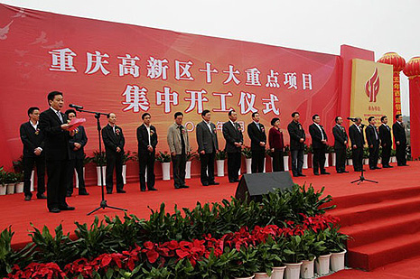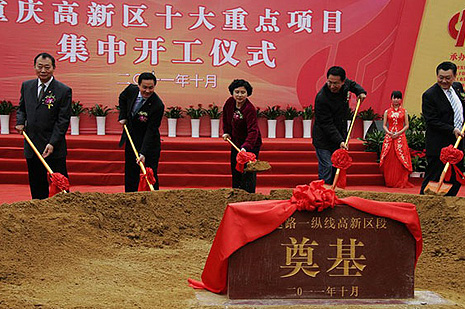 10月26日上午,时值国家级开发区――重庆高新区建区20周年暨高新区管委会重新组建一周年之际,高新区十大重点项目集中开工仪式在市政交通公司承建的快速路一纵线高新区段项目现场隆重举行。重庆市副市长童小平、市政府副秘书长王银峰等市领导以及高新区区委、管委会有关负责人出席仪式,并为快速路一纵线工程奠基。