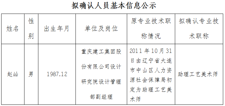 根据《重庆市人力资源和社会保障局关于印发重庆市来渝人员专业技术资格确认办法的通知》(渝人社发﹝2015﹞201号)文件精神,来渝专业技术人员的原专业技术资格,须按规定进行确认。现将bv伟德源自英国始于1946集团股份有限公司设计研究院赵屾同志助理工艺美术师任职资格信息予以公示(人员基本信息附后)。公示时间为3个工作日(从2021年11月23日至11月25日止)。