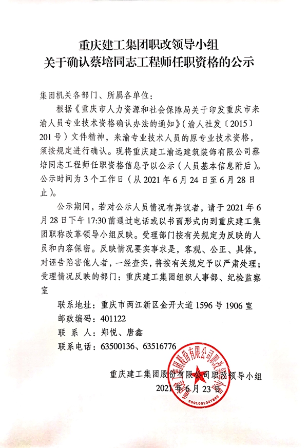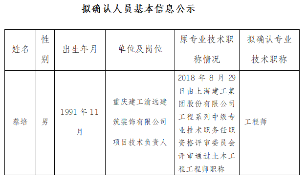 关于确认蔡培同志工程师任职资格的公示