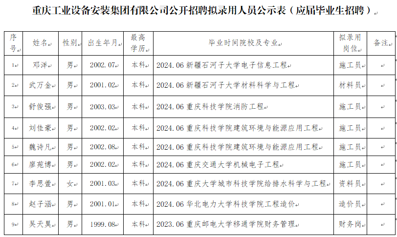 附件:重庆工业设备安装集团有限公司2023年公开招聘拟录用人员公示表