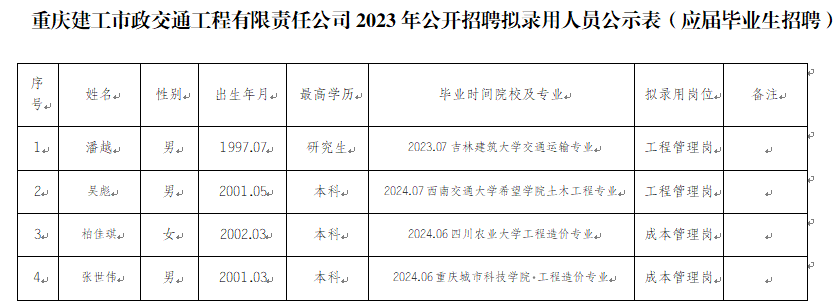 附件:bv伟德源自英国始于1946市政交通工程有限责任公司2023年招聘拟录用人员公示表