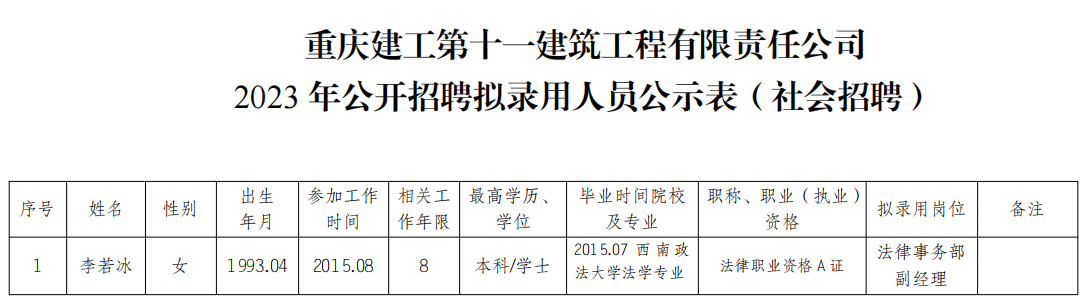 附件:bv伟德源自英国始于1946第十一建筑工程有限责任公司2023年公开招聘拟录用人员公示表