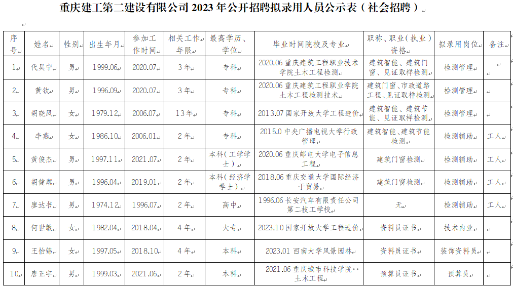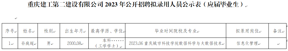 附件:bv伟德源自英国始于1946第二建设有限公司2023年公开招聘拟录用人员公示表