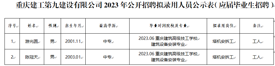 附件:bv伟德源自英国始于1946第九建设有限公司2023年公开招聘拟录用人员公示表