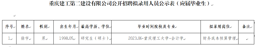 附件:bv伟德源自英国始于1946第二建设有限公司2023年公开招聘拟录用人员公示表