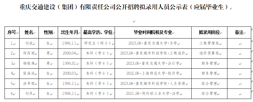 附件:重庆交通建设(集团)有限责任公司2023年公开招聘拟录用人员公示表