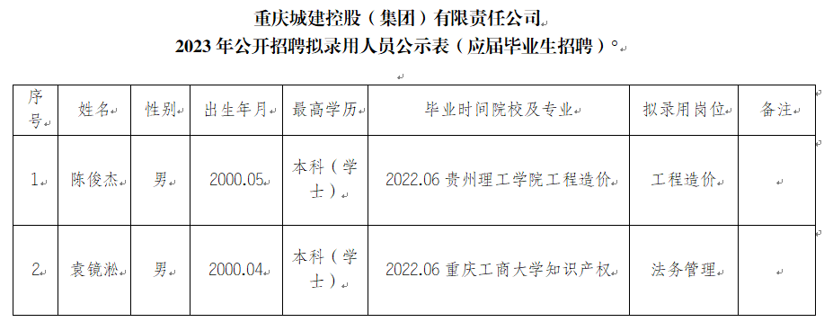 附件:重庆城建控股(集团)有限责任公司2023年公开招聘拟录用人员公示表