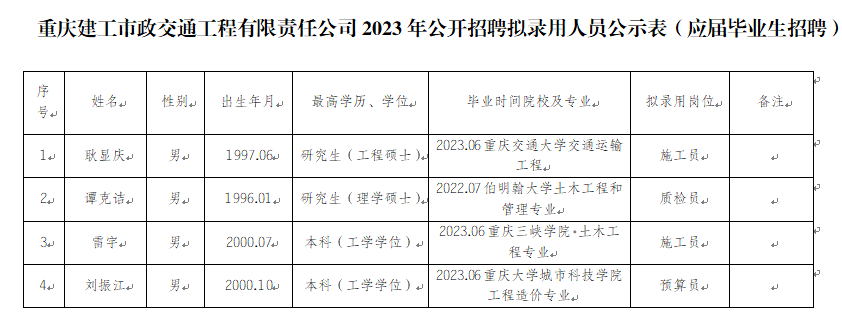 附件:bv伟德源自英国始于1946市政交通工程有限责任公司2023年招聘拟录用人员公示表