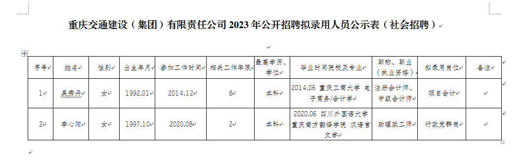 附件:重庆交通建设(集团)有限责任公司2023年公开招聘拟录用人员公示表