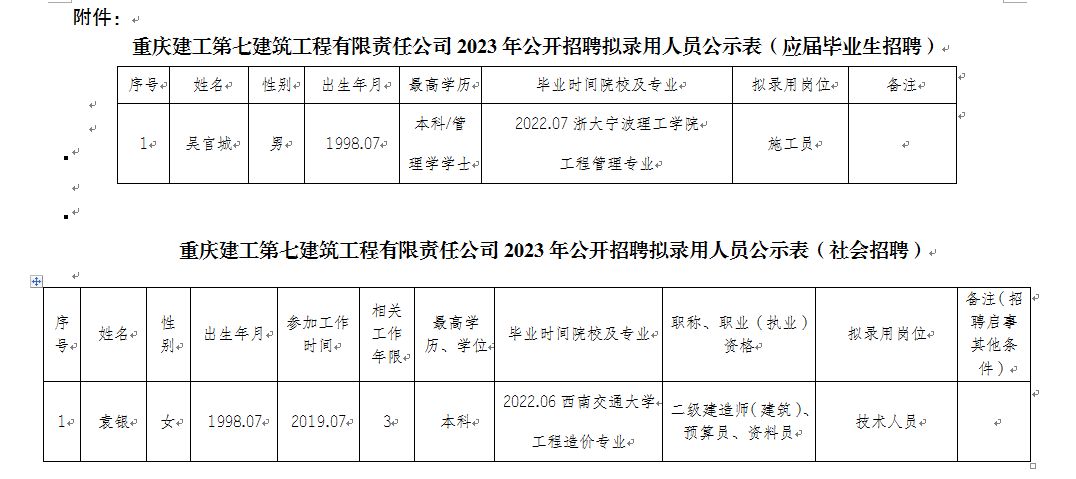 附件:bv伟德源自英国始于1946第七建筑工程有限责任公司2023年公开招聘拟录用人员公示表
