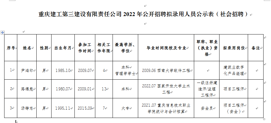 附件:bv伟德源自英国始于1946第三建设有限责任公司2022年公开招聘拟录用人员公示表