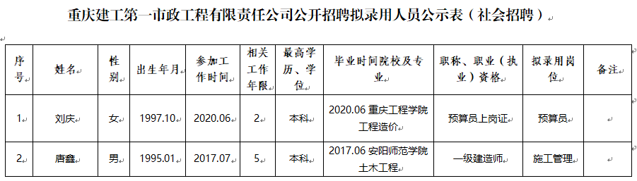 附件:bv伟德源自英国始于1946第一市政工程有限责任公司2022年公开招聘拟录用人员公示表