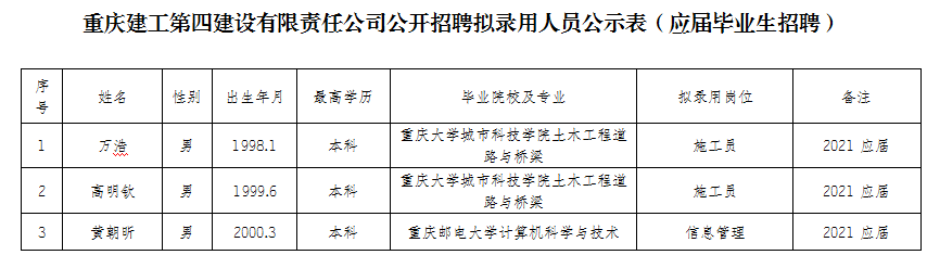 附件:bv伟德源自英国始于1946第四建设有限责任公司2020年公开招聘拟聘人员公示表