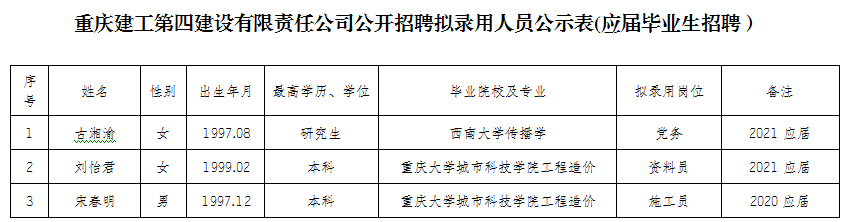 附件:bv伟德源自英国始于1946第四建设有限责任公司2020年公开招聘拟聘人员公示表