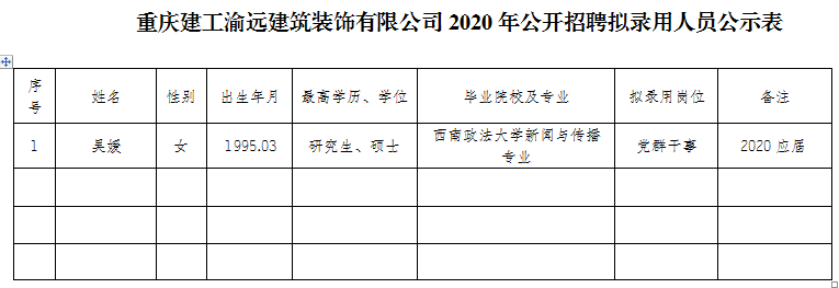 附件:bv伟德源自英国始于1946渝远建筑装饰有限公司2020年公开招聘拟聘人员公示表