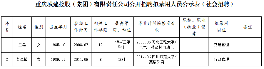 附件:重庆城建控股(集团)有限责任公司2020年公开招聘拟聘人员公示表