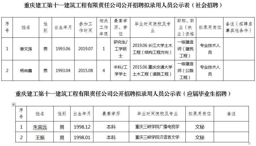 附件:bv伟德源自英国始于1946第十一建筑工程有限责任公司2020年公开招聘拟聘人员公示表