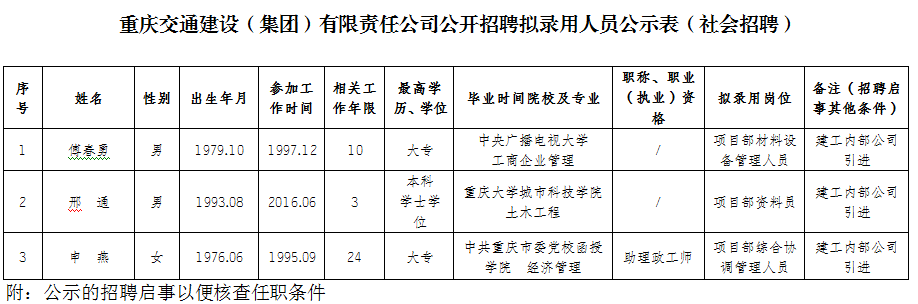 附件:重庆交通建设(集团)有限责任公司2020年公开招聘拟聘人员公示表