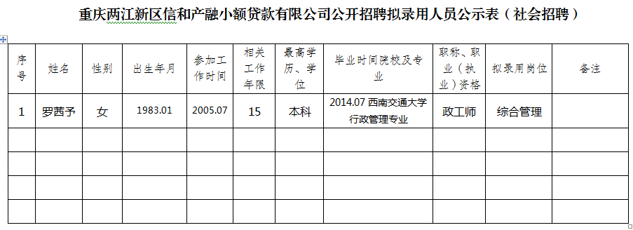附件:重庆两江新区信和产融小额贷款有限公司2020年公开招聘拟聘人员公示表