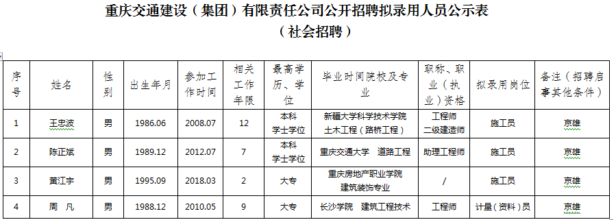 附件:重庆交通建设(集团)有限责任公司2020年公开招聘拟聘人员公示表