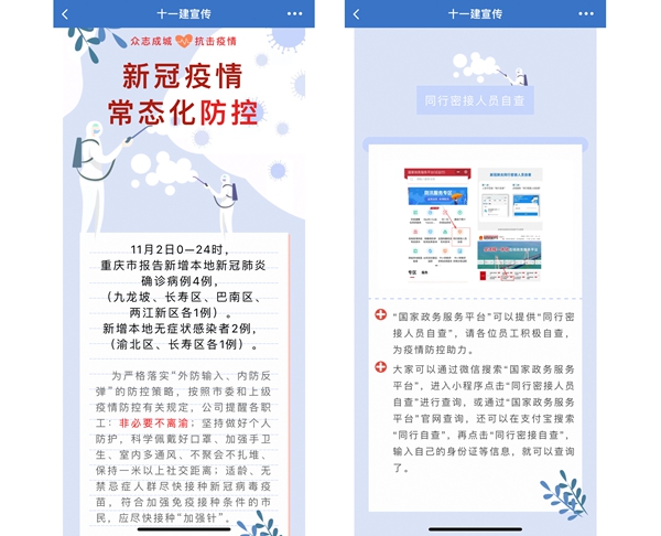 此外,十一建公司还开展了知识科普、政策宣传、信息公布以及储备防疫物资等疫情防控工作。全力打好疫情防控阻击战,为企业高质量发展提供有力安全保障。