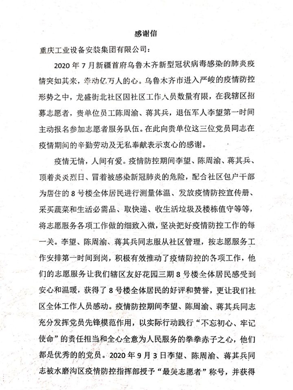 9月7日,新疆乌鲁木齐市的疫情防控工作已经取得阶段性成效。在小区居民的见证下,水磨沟区疫情防控指挥部为在疫情期间作出贡献的志愿者们授予了“最美志愿者”称号,并颁发了“最美志愿者”证书。重庆安装集团新疆分公司的蒋其兵、陈周渝、李望3位志愿者同志位列其中。分公司机关所在的龙盛街北社区第二网格党支部还特地为公司发来了感谢信。