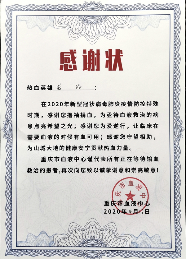 原本以为只是一场平常的献血,4月15日这一天,龙玲却收到了血液中心寄来的感谢信,在信中她被亲切的称作“热血英雄”!她说:“我深知血液保障对临床患者的重要性,作为一名青年党员、一名团干部,关键时刻更要发挥先锋模范作用、冲锋在前,为抗击新冠疫情中的临床用血工作尽一份力。”