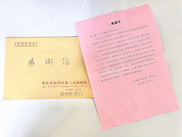 写感谢信的是该司工程管理部职工成书漫的母亲。她是重庆市南岸区第三人民医院检验科的一名检验师,在新冠肺炎疫情防控期间,她一直坚守在一线。她在信中写道:“收到公司的慰问信、慰问金以及防护口罩,我们全家无比激动。新型冠状病毒肺炎肆虐以来,作为医务人员的我积极投身疫情抗击战,无暇照顾家庭,正是因为公司的英明领导,安排我女儿在家办公,在她办公之余承担了全家人的饮食起居,让我无后顾之忧地全身心投入工作。在此,我真诚地向公司在疫情防控战中积极承担的社会责任表示衷心的感谢。”