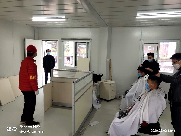 疫情隔离期间,职工理发成为一项难题。经常听到“我都一个月没理发了”的“抱怨”,志愿者马上配合项目工会小组组织庙宇镇的理发师傅到项目部来为同事们理发,并在理发期间积极维护现场秩序,敦促剪发期间的防疫工作。在每位同事理发前都对其消毒,保证理发期间的安全。