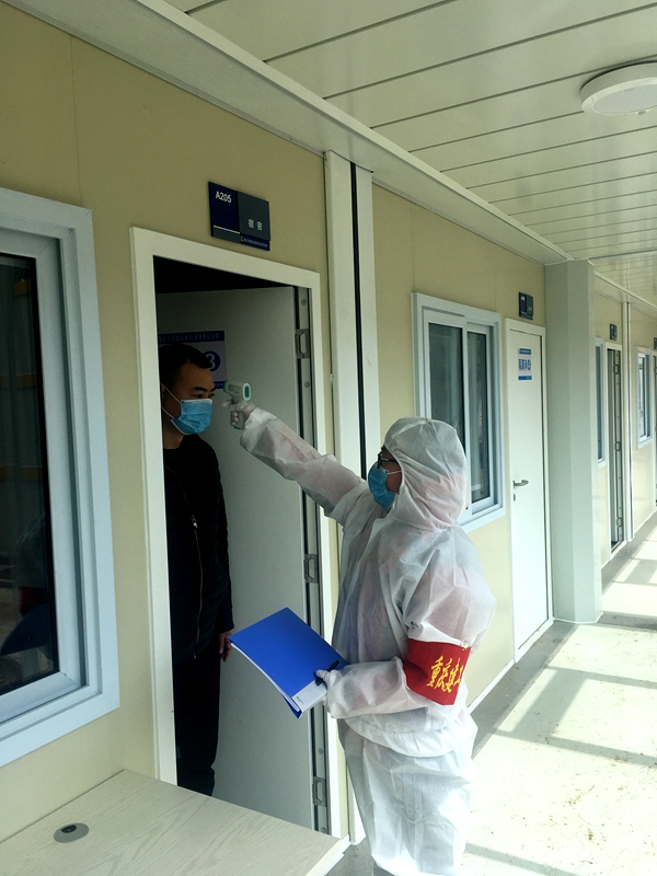 自2月28日起,总承包项目部驻地施工工人陆续入场,面临出入人员数量增加,增大疫情感染风险的情况,青年志愿者主动承担了复工工人防疫防控等相关工作。在项目部大门入口岗哨处,志愿者对于出入施工的人员每天进行三次的体温检测,如有体温异常的人员,一律不让进入项目部内。对于进入项目部的车辆,均在车身及四个轮胎上喷洒消毒液进行外部消毒。
