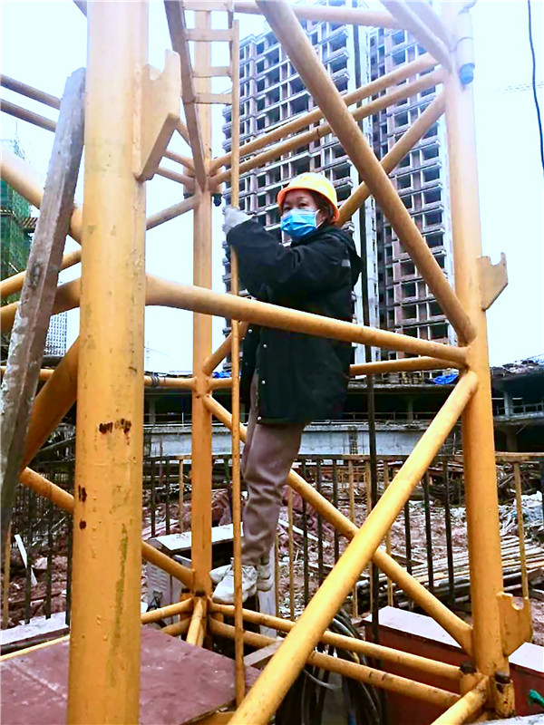 住建公司敬澜山项目女塔机司机赵世敏正在作业(作者:杨霞)