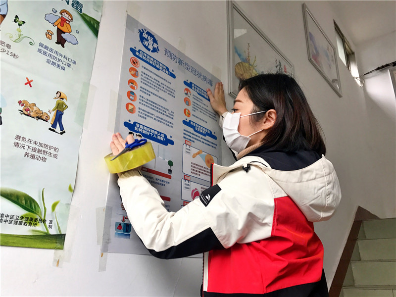 城建集团材设分公司综合办主任裴小玲张贴社区街道发的疫情防控海报(作者:伍修怡)
