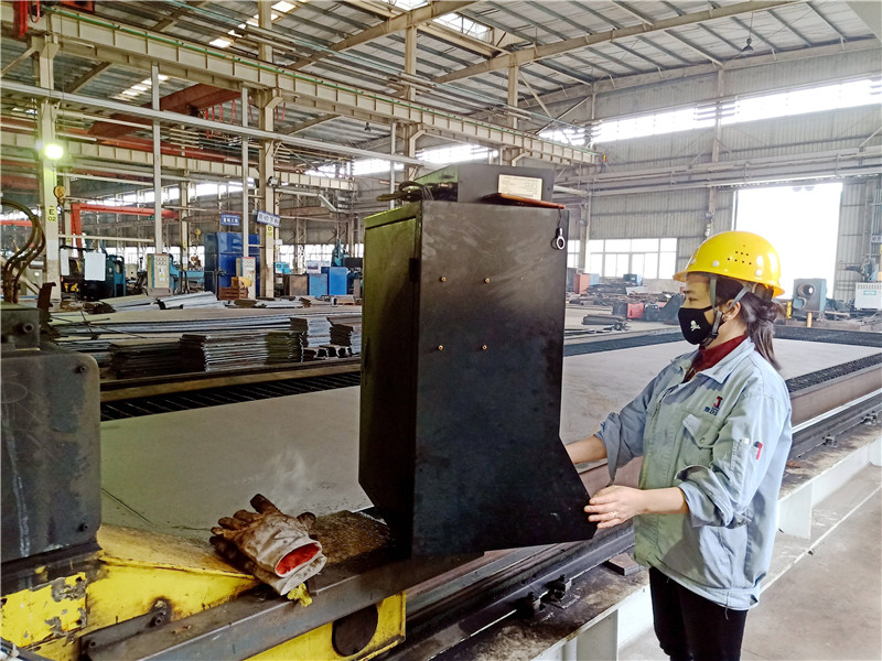 工业公司女职工文娟正在钢结构车间测量设备(作者:王吴川)