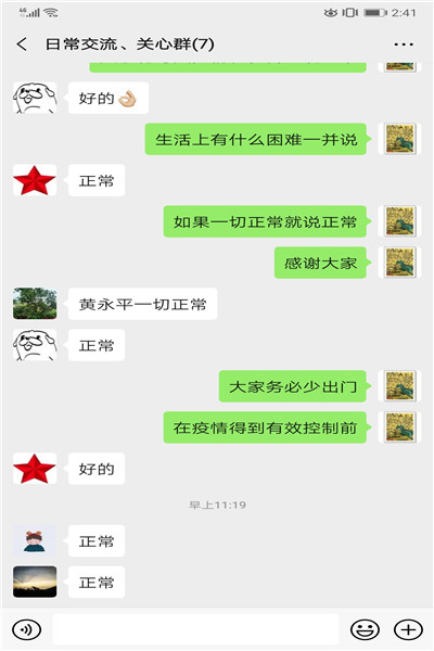 身处疫区或途经疫区的八名工业公司职工每天都会收到几条来自公司同事的微信问候。