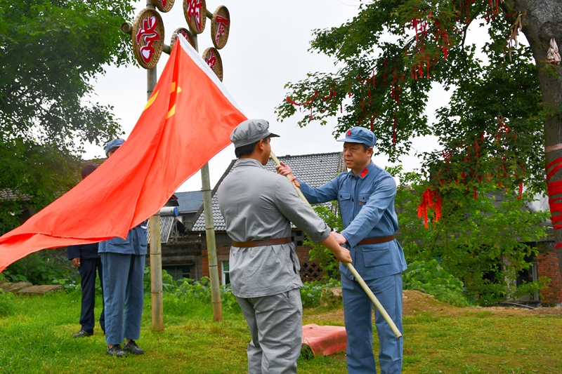 驱车前往途中,同志们通过合唱红歌、有奖竞答等形式,强化了对党的历史、集团和公司制度的认识和理解。“这里是1935年中央红军长征过境重庆时红一军团一师二团的指挥部驻所。红军来到我们这,纪律严明、秋毫无犯,与我们当地老百姓建立了鱼水相融的深厚友谊。邓华将军带领他的两个警卫员,为了监视伪政府的伪职人员进出情况,给工农红军探秘敌情,在这棵枫香树下住了两天两夜”。在安稳镇羊角村枫香树下。当地老党员为大家讲述红军往事,以最直观的方式让在场所有人体会到革命前辈的初心。随后开始授旗仪式,党委书记张斌代表全体党员接过党旗、团委书记何光华接过军旗,带领一行人向长征路前进。